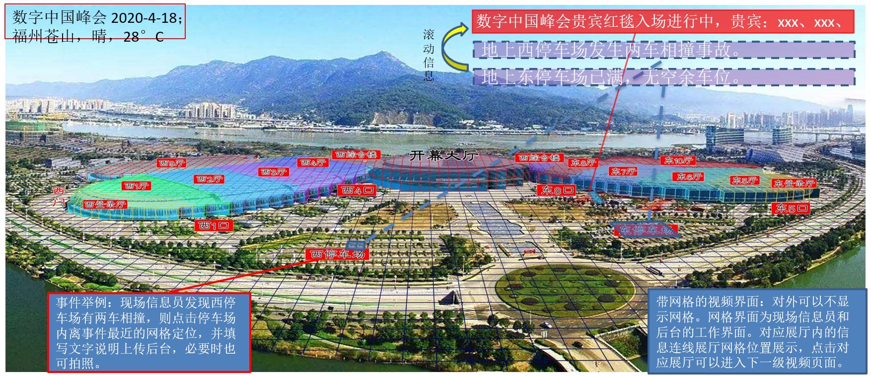 通過給福州倉山海峽會(huì)展中心安裝多個(gè)高位攝像頭,利用北斗網(wǎng)格編碼和三維網(wǎng)格立體建模技術(shù),實(shí)現(xiàn)視頻內(nèi)容空間感知、快速定位、高效管理、多源數(shù)據(jù)協(xié)同分析能力的視頻網(wǎng)格化管理系統(tǒng),滿足跨鏡頭跟蹤、人群趨勢(shì)分析等應(yīng)用需求,從而快速、高效地實(shí)現(xiàn)會(huì)展中心視頻監(jiān)控智能管理、重點(diǎn)區(qū)域安全態(tài)勢(shì)感知及實(shí)時(shí)指揮,提升會(huì)展中心安防管控能力和應(yīng)急事件響應(yīng)能力。